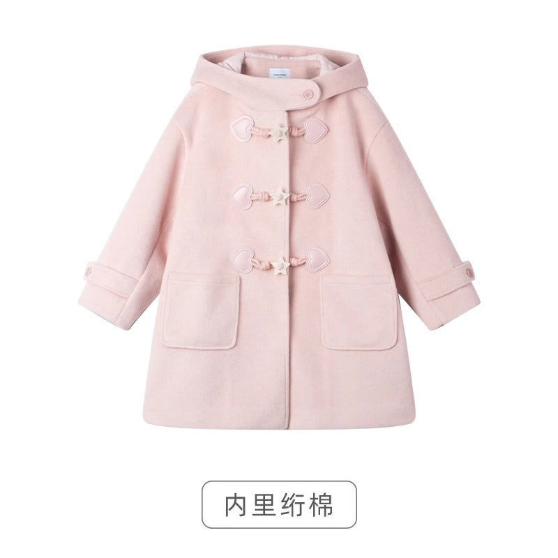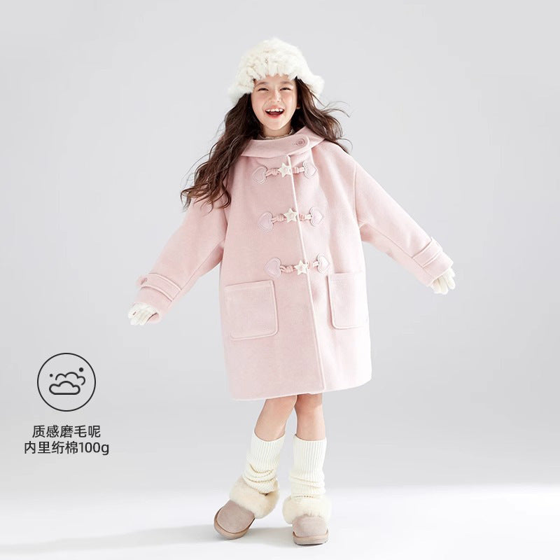 2025 New Girls’ Peach Pink Woolen Coat – Thick Warm Winter Jacket with Cute Star Croissant Buckles