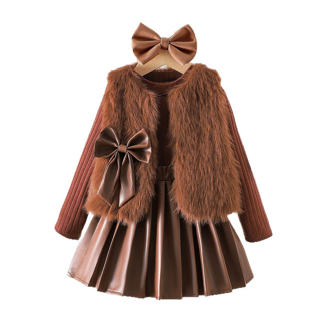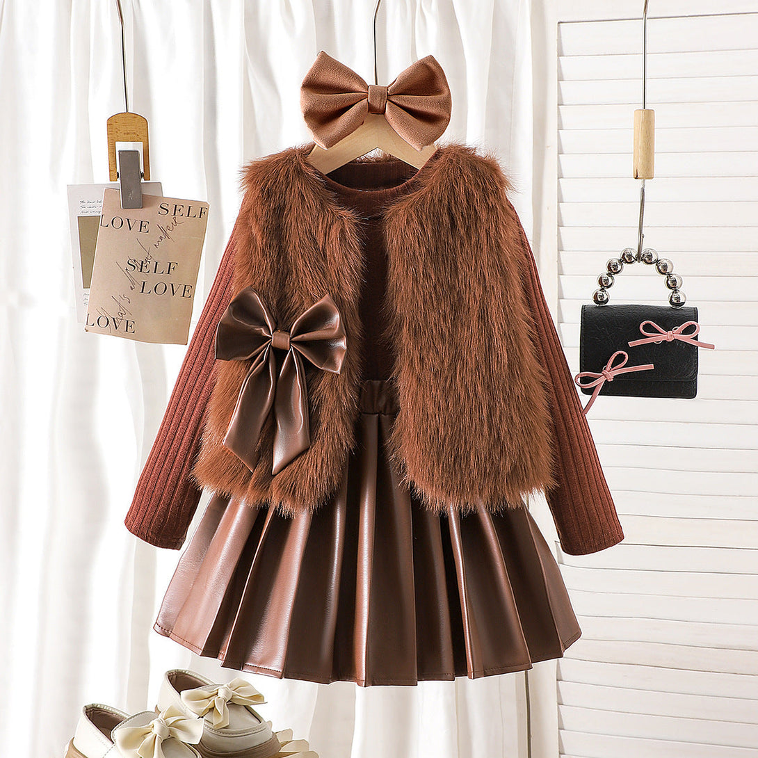 Girls’ 3-Piece Set – Coffee Vest, Pleated Skirt & Long Sleeve Base Shirt | 2025 Cross-Border Kids’ Fashion Outfit