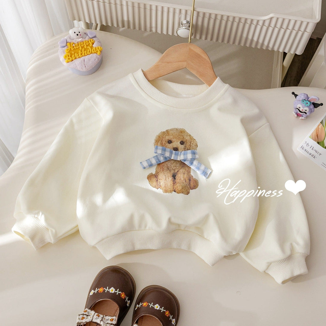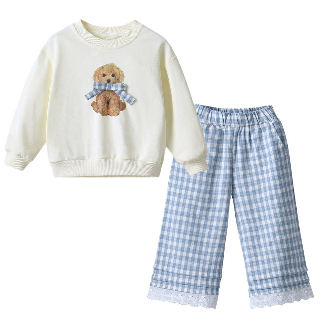 2025 Girls’ Spring Autumn Outfit Set – Cute Bow Printed Sweater + Lace Plaid Pants, Fashionable Foreign-Style Two-Piece Suit