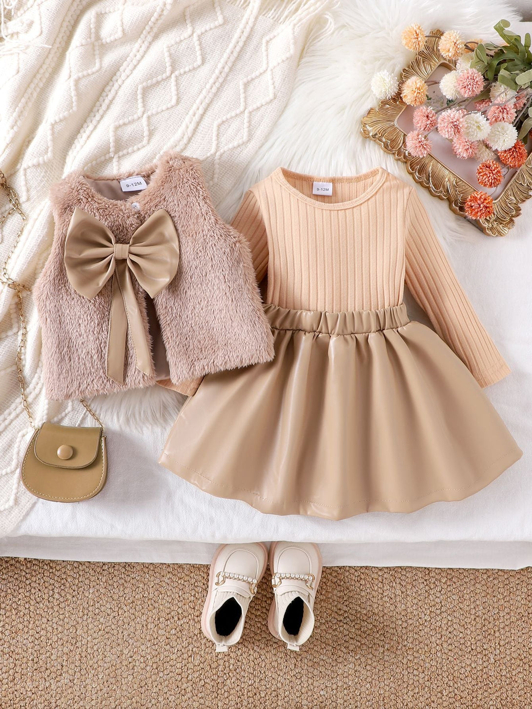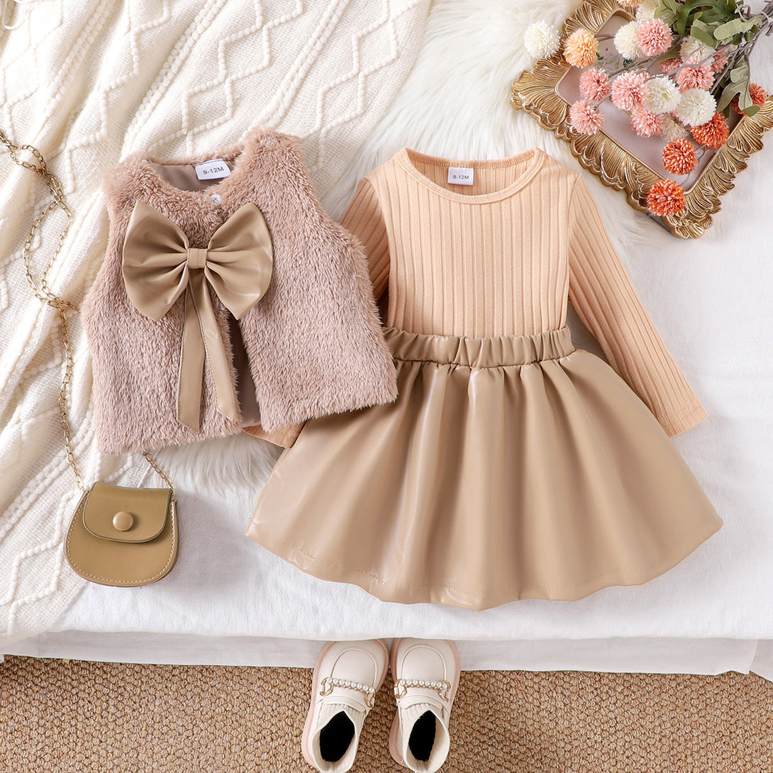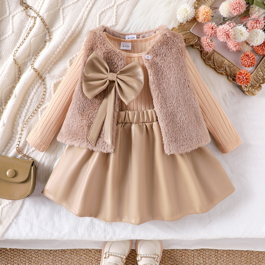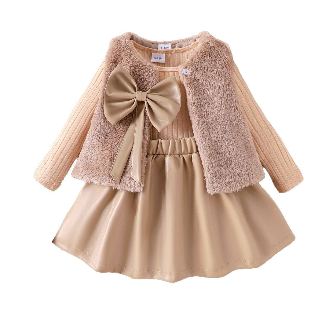 Girls’ Autumn Winter 3-Piece Set – Coffee Long Sleeve Shirt, Vest & Skirt | New 2025 Cross-Border Kids’ Fashion Outfit