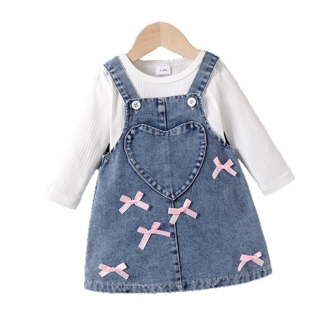 2025 New Kids’ Autumn Winter Set – White Long-Sleeve Shirt + Blue Strap Dress, Trendy Foreign Trade Outfit for Girls